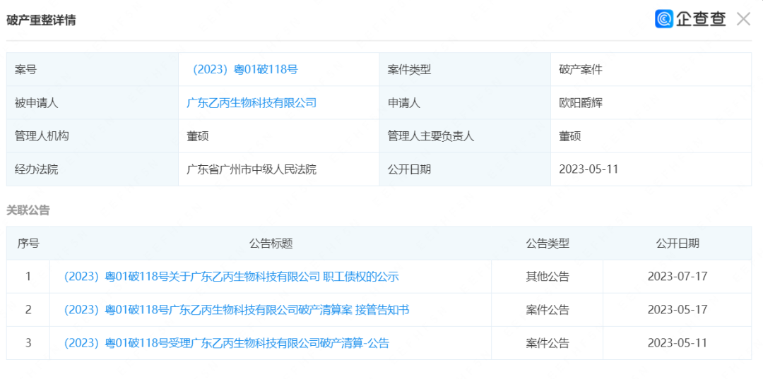 以乙丙生物为例,今年5月,广州市中级人民法院正式受理其破产清算案件。企查查显示,乙丙生物注册资本1000万元,代工品牌包括袋鼠妈妈、丁家宜等,该公司今年多次因拖欠货款被合作公司诉诸法庭,最终因缺乏清偿能力而走向破产清算。